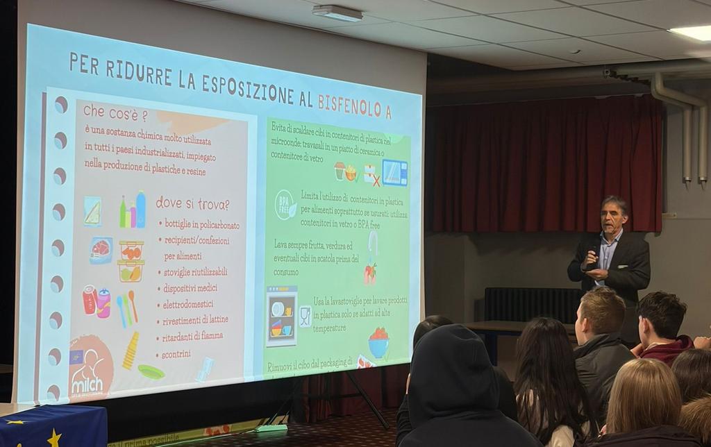 As part of the European LIFE MILCH project environmental awareness activities were organized and carried out in middle and high schools in the city of Parma. In January 2026, the project specifically involved Fra Salimbene Middle School. In agreement with the school's management and the Department of Mathematics and Science (led by Professor Maria Chiara Montani), workshops were organized with all third-grade classes, involving approximately 150 students and 10 teachers. A LIFE MILCH supermarket was reconstructed in the school's science classroom, and students were guided by Professor Federica Piccoli in choosing products low in endocrine disruptors. The activity concluded with a plenary session in which students met directly with the university professors involved in the LIFE MILCH project, Professor Maria Street (pediatric endocrinologist) and Professor Francesco Nonnis Marzano (biologist). A themed exhibition was also set up at the school and informational materials were distributed, thus indirectly engaging the entire school population. The school activities represent an important opportunity for the LIFE MILCH project, aiming to raise awareness among young people about healthier lifestyles and dietary choices. The goal of the LIFE MILCH project is to provide, based on the scientific data generated, concrete recommendations for reducing exposure to endocrine disruptors and improving public health.